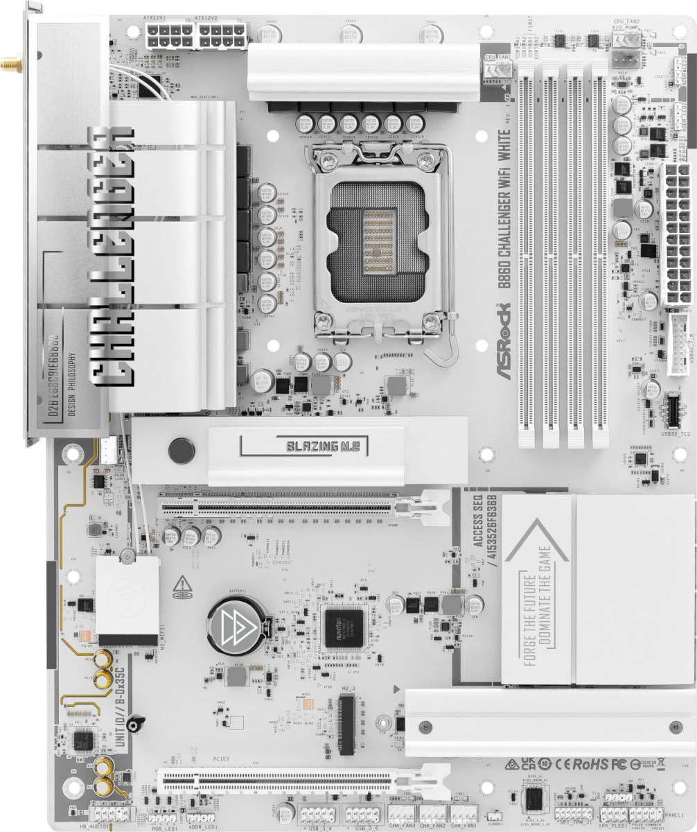 Piegāde visā Latvijā un iespēja saņemt pasūtījumu izsniegšanas punktā. Ērti norēķinu veidi. Iespēja apmaksat tieši interneta veikalā, ar karti vai skaidrā naudā preces saņemšanas punkta. Detalizēts preču apraksts un salīdzināšanas iespēja. Populārākie zīmoli no pasaules ražotājiem. 171,20 € Preces ID: 45538 Pamatplate ASRock B860 Challenger WiFi White (90-MXBUB0-A0UAYZ) PamataRažotājs ........................................................................................................................................................................................................ Ražotāja kods ........................................................................................................................................................................................................ 90-MXBUB0-A0UAYZ Ligzda ........................................................................................................................................................................................................ LGA1851 Mikroshēmu kopa (Chipset) ........................................................................................................................................................................................................ Intel B860 AtmiņaAtmiņas veids ........................................................................................................................................................................................................ DDR5 Atmiņas slotu skaits ........................................................................................................................................................................................................ 4 Diska kontrolieriSATA kontrolieris ........................................................................................................................................................................................................ 4 x SATA-III (6 Gb/s) RAID atbalsts ........................................................................................................................................................................................................ 0, 1, 5, 10 Paplašināšanas slotiPaplašināšanas sloti ........................................................................................................................................................................................................ PCI-E 5.0 x16, PCI-E 4.0 x16, 4 x PCI-E M.2 M.2. slotu veids ........................................................................................................................................................................................................ - 1 x M.2 Socket (Key E), supports type 2230 WiFi/BT PCIe WiFi module and Intel® CNVio/CNVio2 (Integrated WiFi/BT)